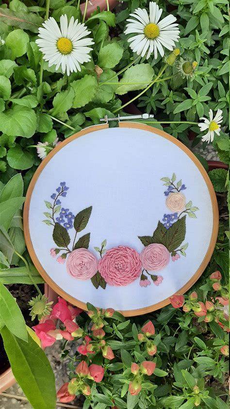 Hand embroidery bullion knot stitch, botanical flowe