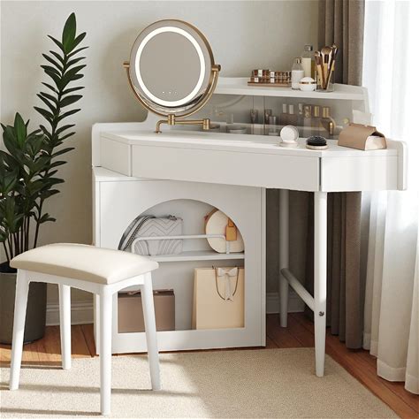 Corner Vanity Desk With Mirror And Lights, Modern Makeup Vanity With Charging Station, Extendable Dressing Table With Drawers And Dresser For Women Girls, White