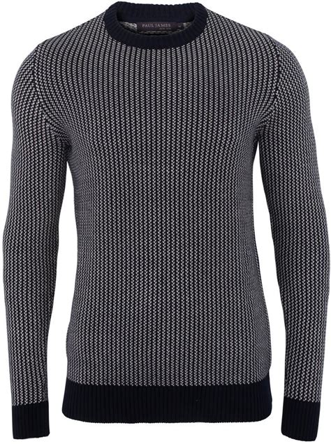 White / Blue Mens Cotton David Fisherman Tuck Stitch Jumper - Navy | Extra Large | Paul James Knitwear