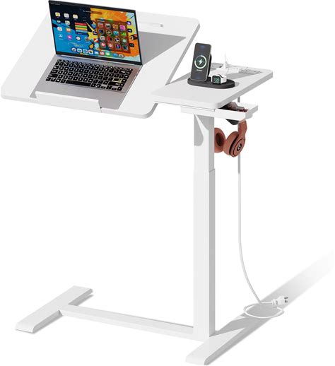 EKNKOZY Standing Desk, Medical Overbed Table With Rolling Tray And Power Outlet, Dual Pneumatic Angle And Height Adjustable Desk, Portable Side Table