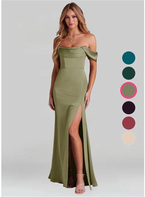 Azazie Sheath Off The Shoulder Floor-Length Stretch Satin Bridesmaid Dresses, Pistachio , Size A6