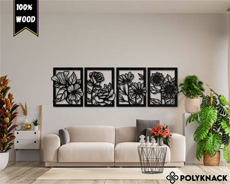 Floral Wall Art, 4 Piece Flower Wall Decor, Plant Art, Wood Wall Art, Large Wall Panel Decor, Over The Bed Decor, Over The Couch Wall Art