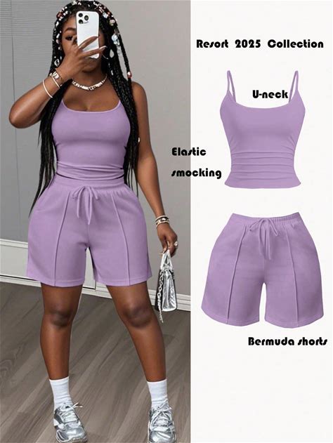New Spring And Summer Casual Basic Sports Style U-Neck Suspender Vest + Five-Point Trousers With Tooth Strips Decorative Sweatpants White Women's Two Pieces Set-A Women 2 Pieces Short Sets Women Summer Shorts Set 2 Pieces Ber