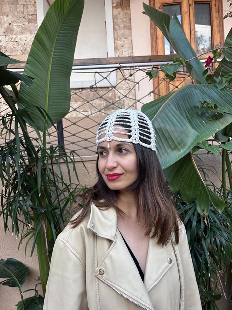 Cream Skull Cap Beanie With Seashell, Cotton Crochet Mesh Hat