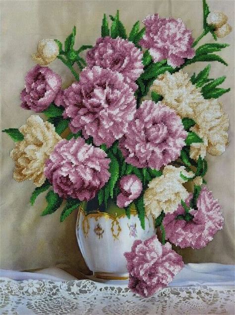 Bead Embroidery Kit Peonies Diy Craft Stamped Bead Needlepoint Beaded